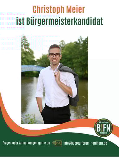 Christoph Meier ist der richtige Mann für Nordhorn! Er hat bereits 2019 als unabhängiger Kandidat 28,4% der Stimmen erhalten und zeigt, dass er Menschen zusammenbringen und unsere Stadt weiterentwickeln kann. Er bringt politische Erfahrung mit, hat gute Netzwerke in Politik, Wirtschaft und Vereinen und besitzt Empathie, um sich der Anliegen und Sorgen der Bürgerinnen und Bürger anzunehmen.